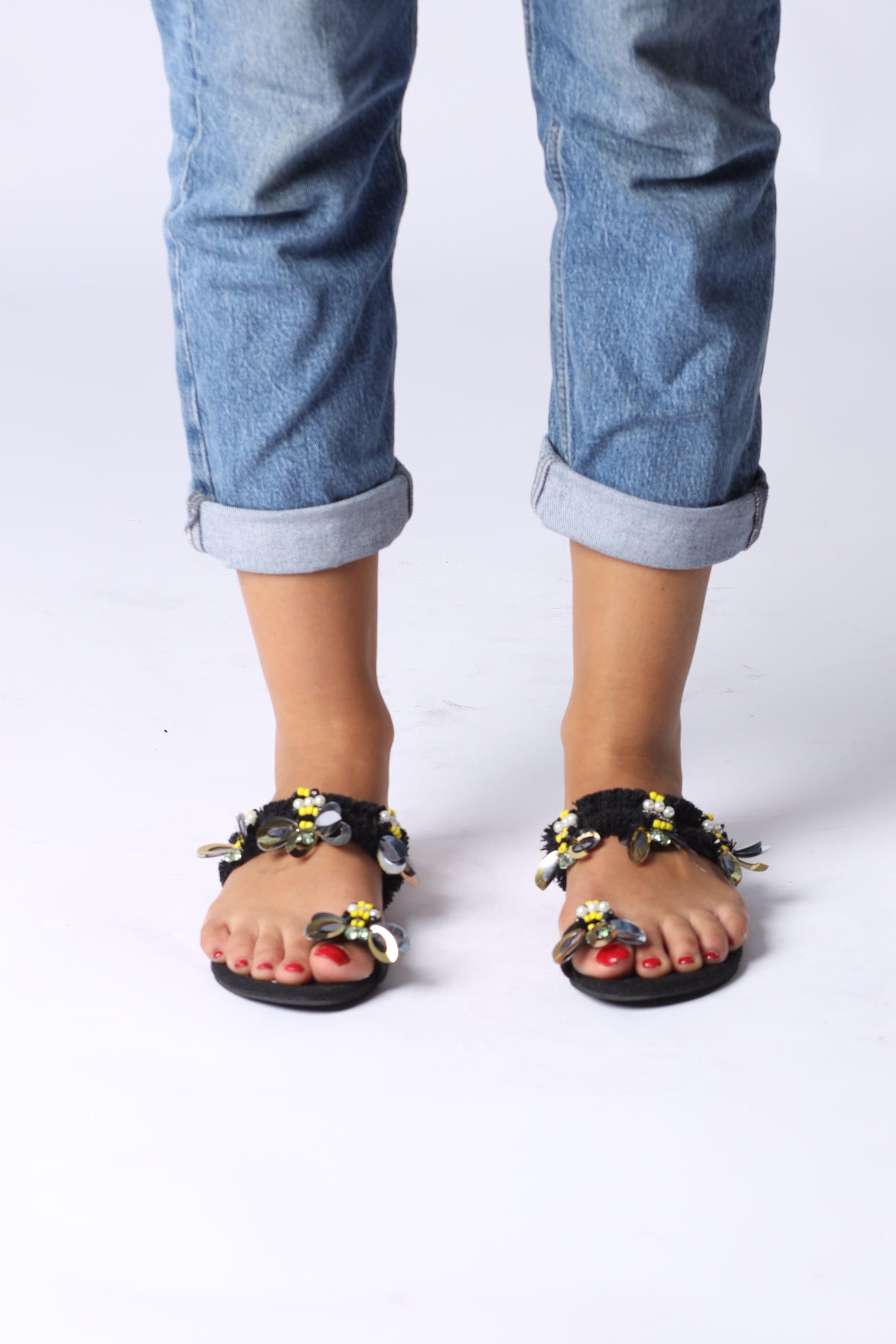 Hand-embellished with yellow beaded bees, shimmery sequins, and a textured black base, these beauties are made to turn sidewalks into runways. Comfy, cute, and dripping in queen energy.